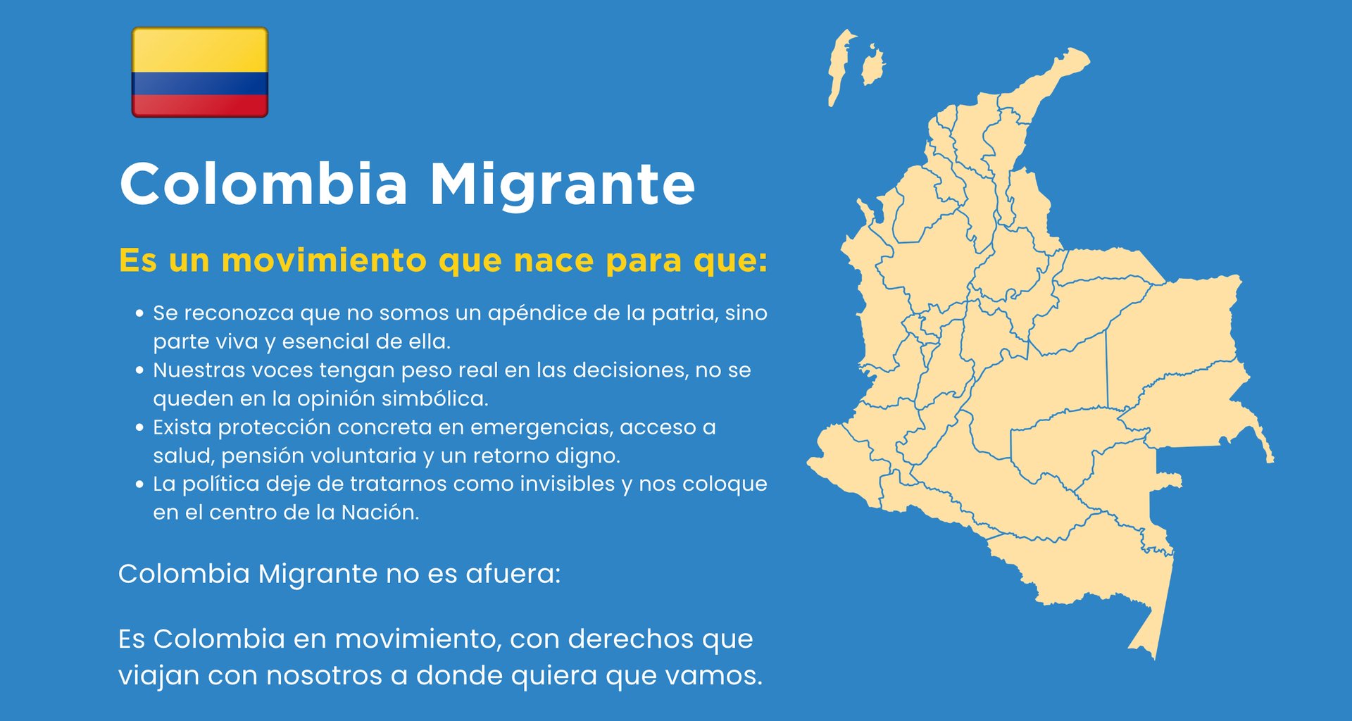 Tenemos listo el borrador del Proyecto de Ley de la Colombia Migrante que creará el Sistema de Apoyo para la Colombia Migrante (SACOMI). No más adornos ni discursos vacíos. Participación real, no simbólica. Igualdad de derechos dentro y fuera de Colombia. Corresponsabilidad: el Estado, la comunidad y nosotros mismos poniendo el hombro. Cero burocracia inútil y total transparencia. Esta no es una ley para engordar oficinas, es para que la Colombia Migrante tenga voz, dignidad y resultados.